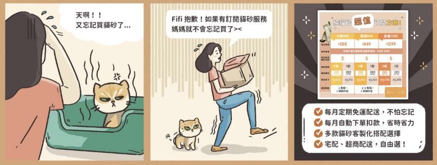 貓砂訂閱制是定期自動配送貓砂,確保不斷貨,並按期扣款。