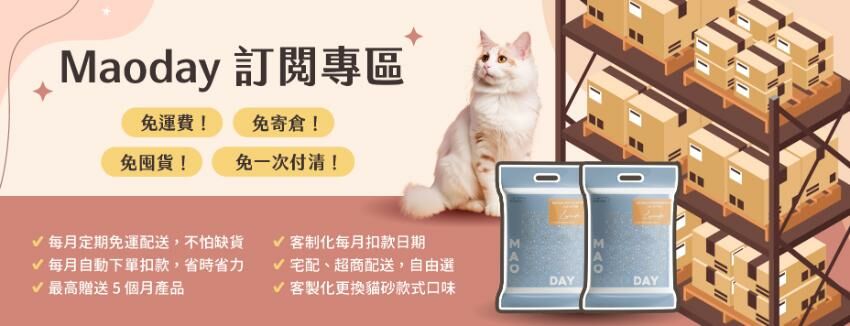 貓砂寄倉則是購買後將貓砂存放於Maoday倉庫,按顧客所需分批配送。
