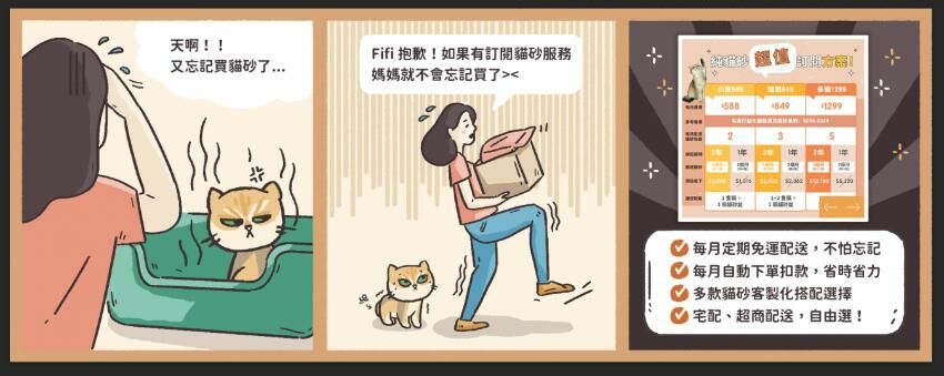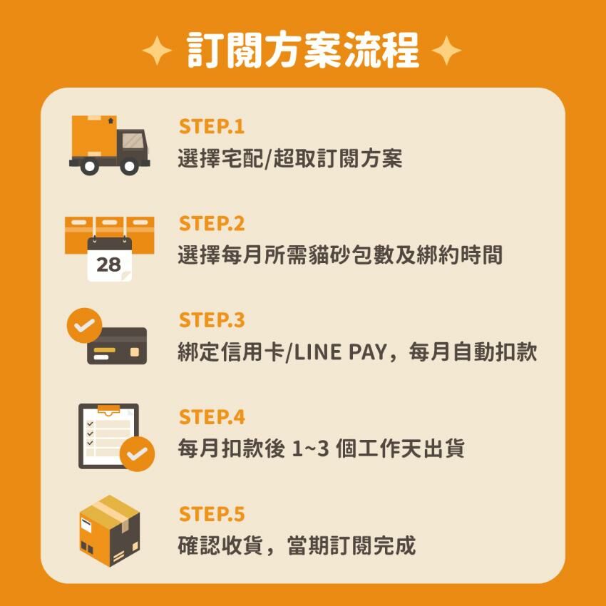 貓砂訂閱制是定期自動配送貓砂,確保不斷貨,並按期扣款。