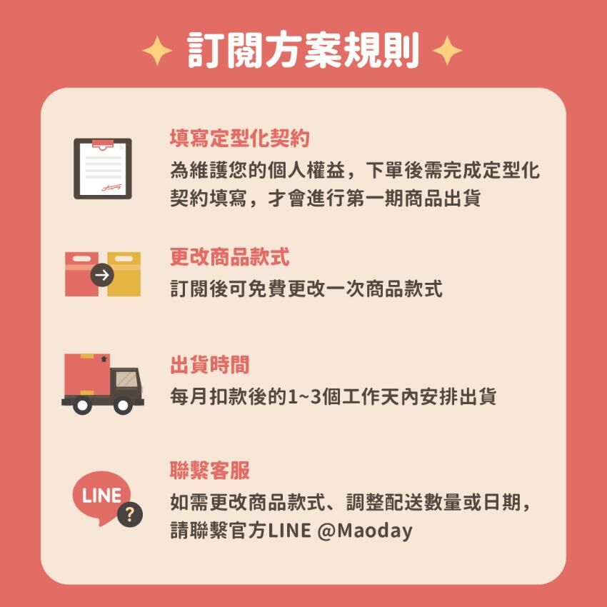◼此方案依據物流配送進行,若有變動,Maoday保有調整或暫停方案的權利。如有變更,我們將透過電子郵件及簡訊通知您。