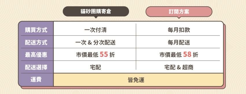 差別:訂閱制為自動定期配送,寄倉需自行通知配送貓砂。